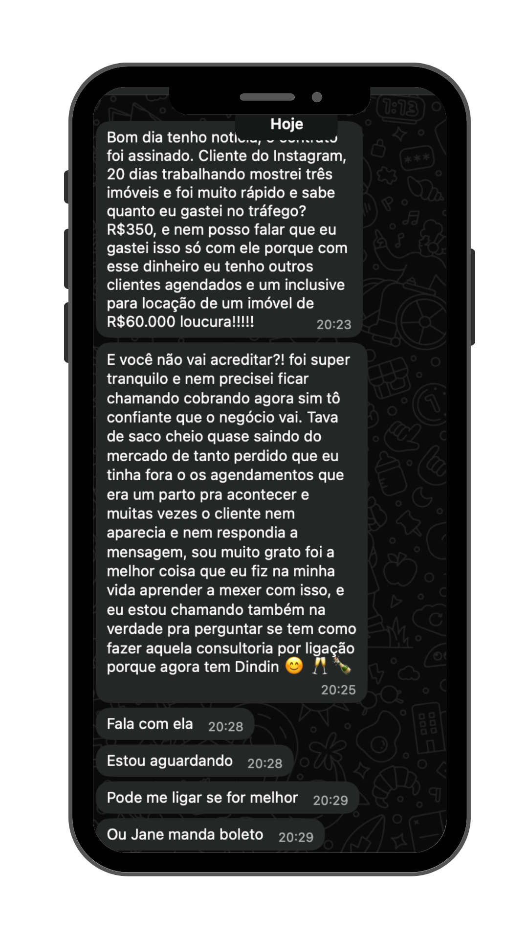 Desde o primeiro dia que eu entro em uma conta, mesmo sem dados, sem histórico e sem qualquer inteligência prévia, eu consigo gerar resultado. No mínimo, dois clientes por dia no WhatsApp, com real interesse em comprar, ou alugar imóveis.